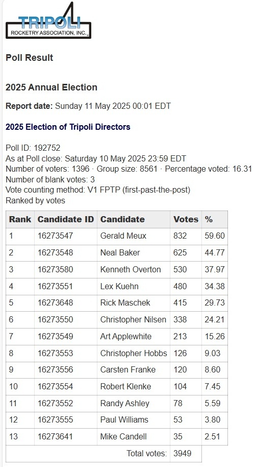 This year's successful candidates are Gerald Meux, Neal Baker, and Ken Overton.  Full results are available on this page, and at the link to our voting system as shown.